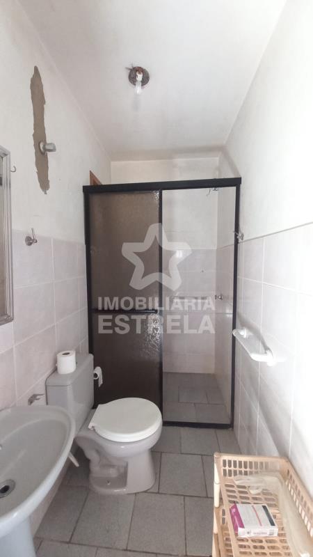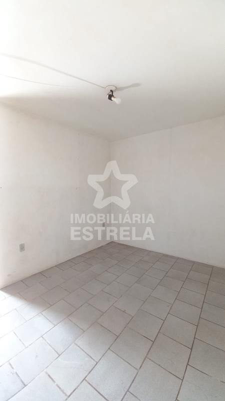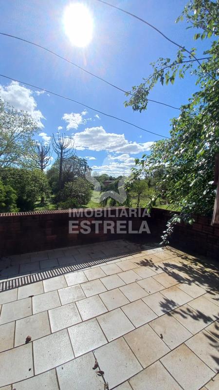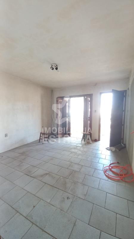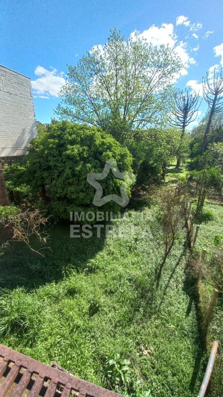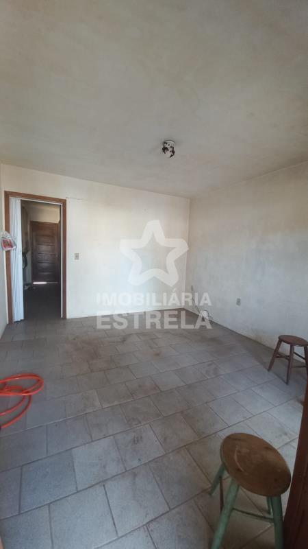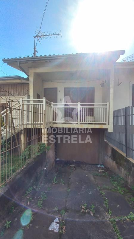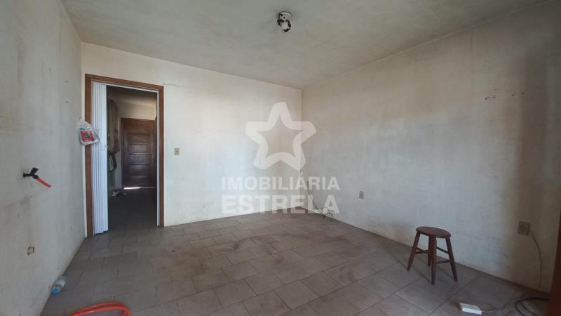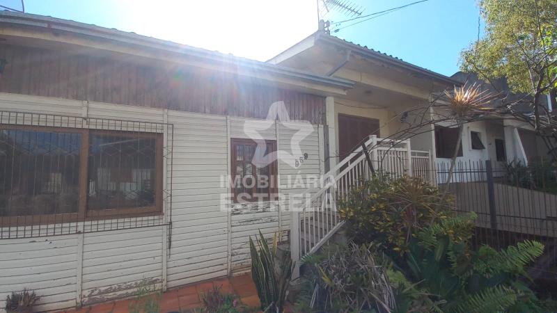 Casa com suíte, sala de estar e cozinha integradas, varanda, área de serviço, garagem e porão e uma casa de madeira inabitável.